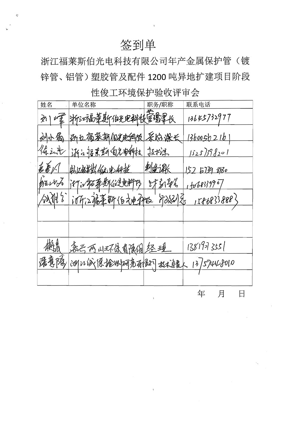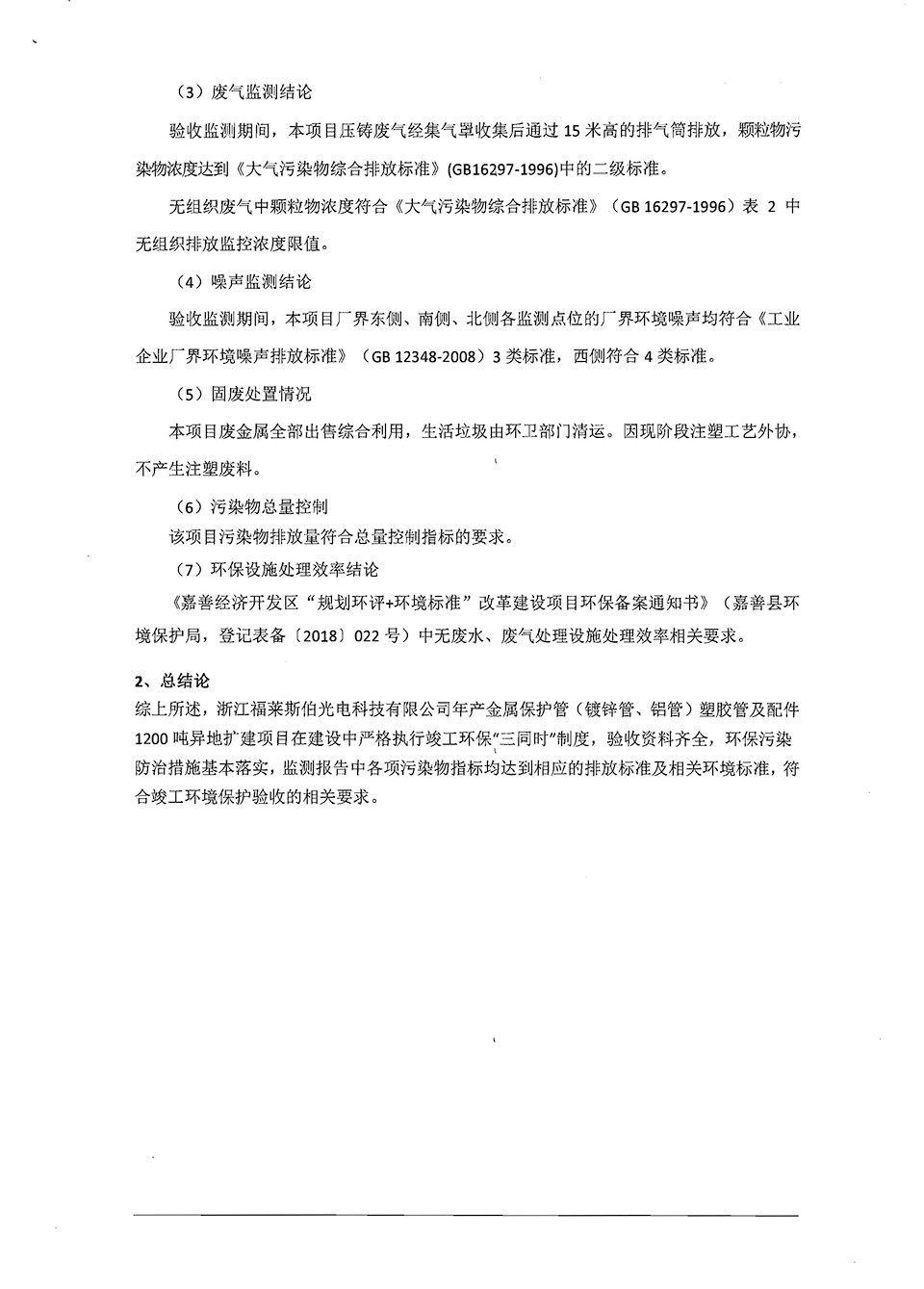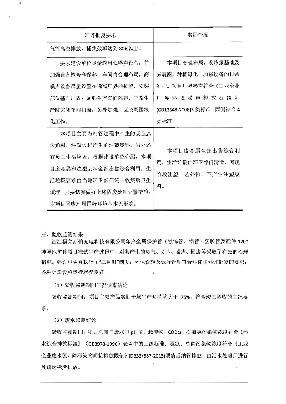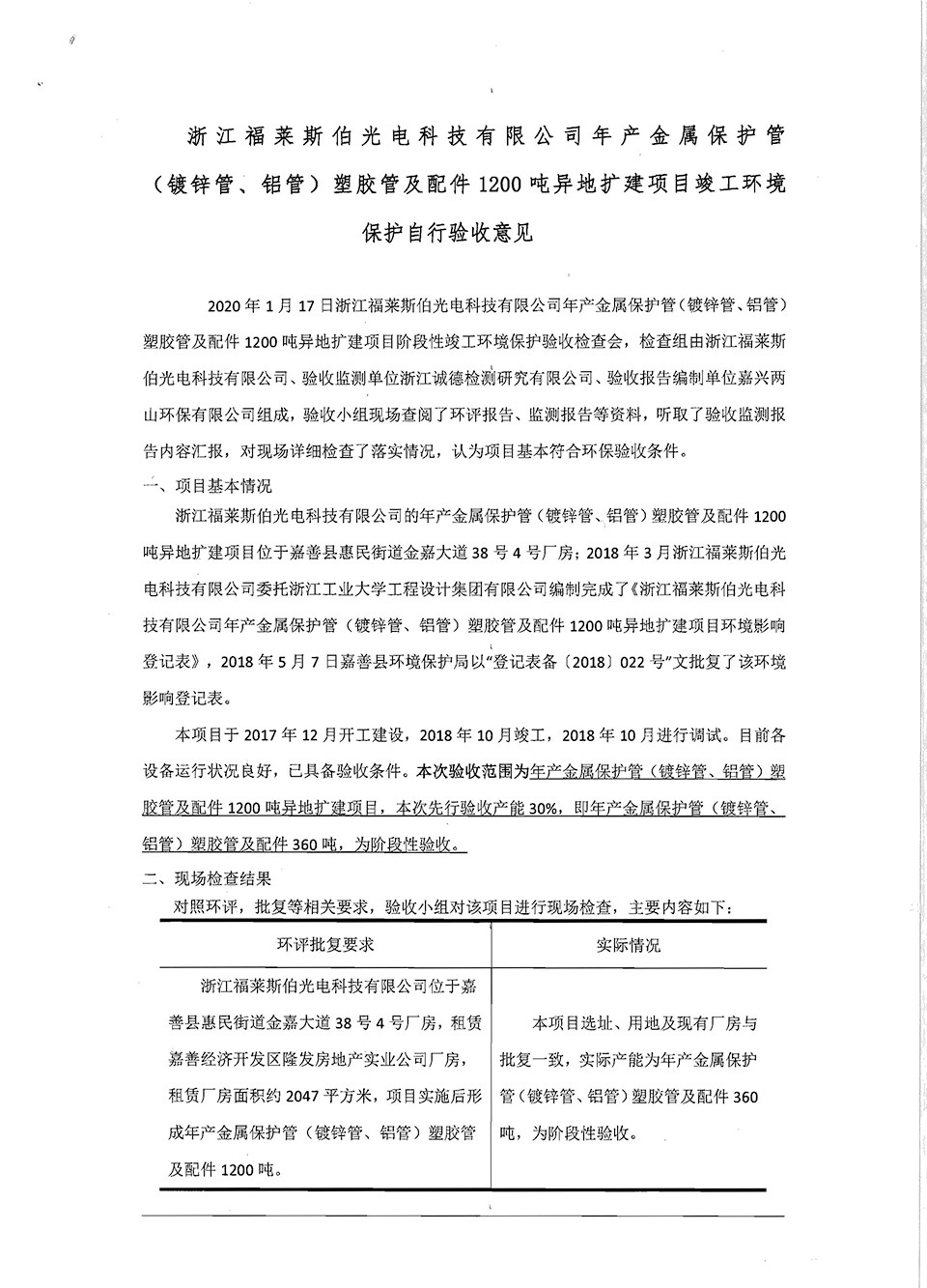 浙江福萊斯伯年產(chǎn)金屬保護(hù)管(鍍鋅管,鋁管)塑膠管及配件1200噸異地?cái)U(kuò)建項(xiàng)目竣工環(huán)境保護(hù)自行驗(yàn)收意見(jiàn)